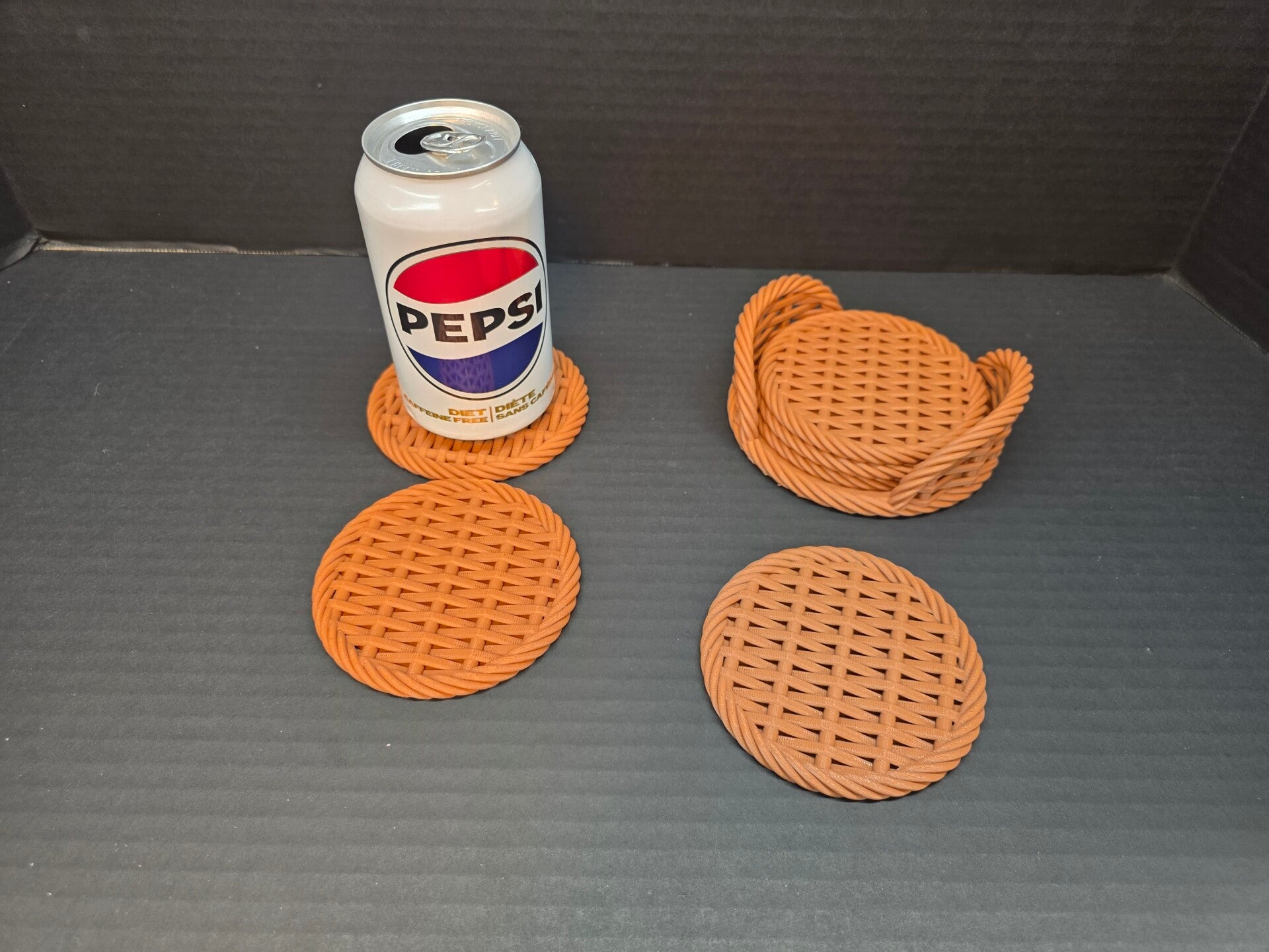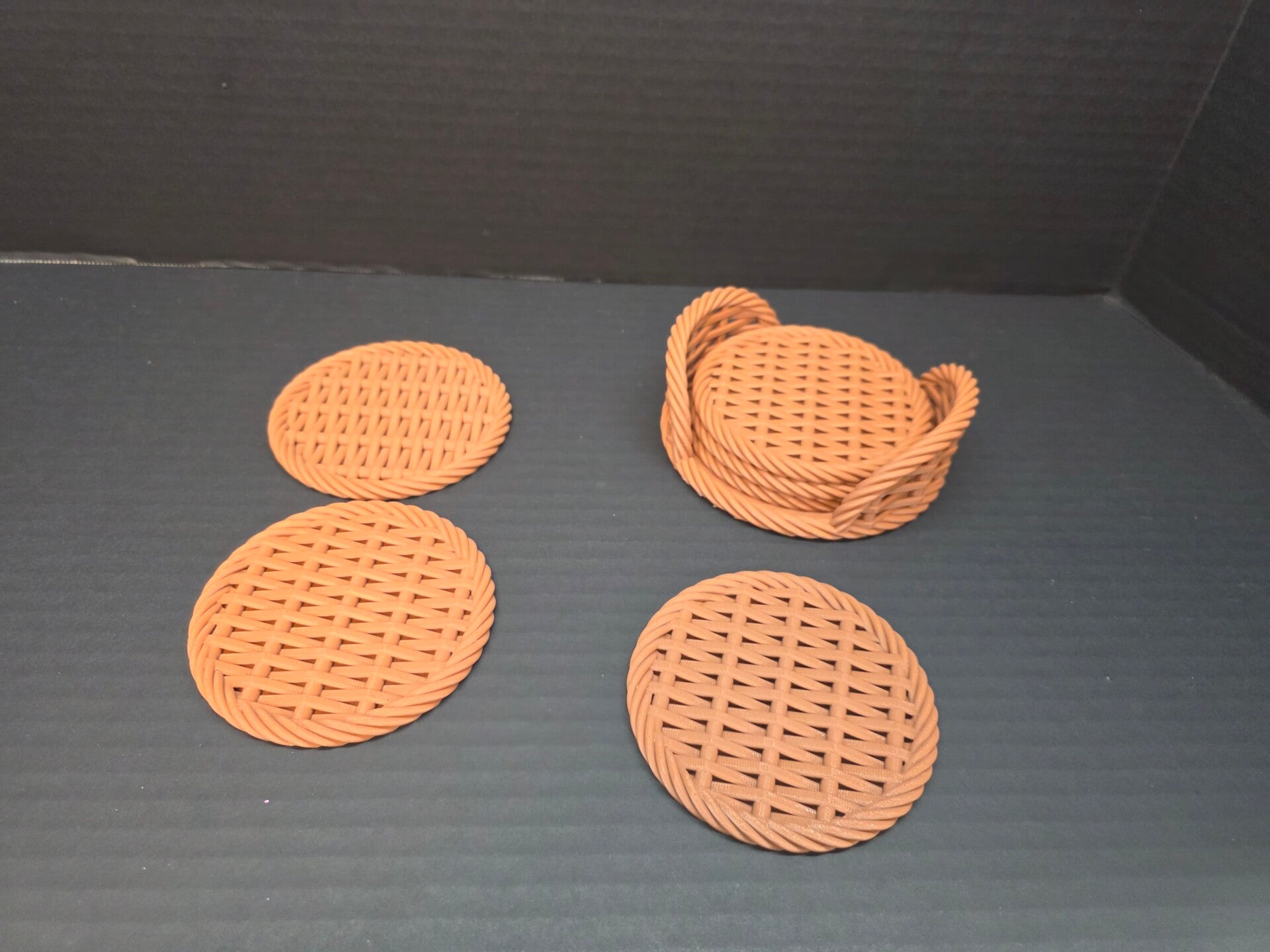 3D printed faux wicker coaster pack, comes with 6 coasters, 3.75'' diameter on cthe coasters.
